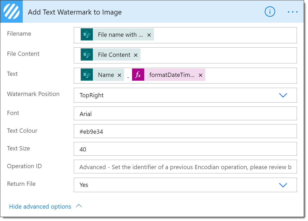 6b. We then pass the file content returned by the previous action to the Encodian Image – Add Text Watermark (previously Add Text Watermark to Image) action, specifying the following properties: