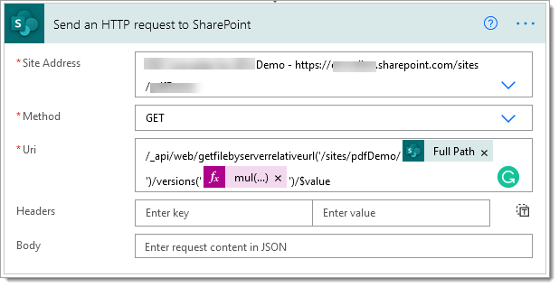 /_api/web/getfilebyserverrelativeurl('/sites/demo/@{triggerOutputs()?['body/{FullPath}']}')/versions('@{mul(sub(int(substring(triggerOutputs()?['body/{VersionNumber}'],0,indexOf(triggerOutputs()?['body/{VersionNumber}'],'.'))),1),512)}')/$value