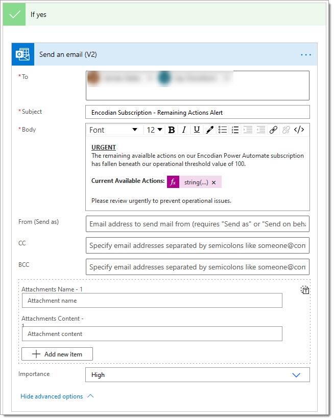 6. In the ‘Yes’ branch, add a ‘Send an email‘ action and configure it as needed to provide an automated notification.