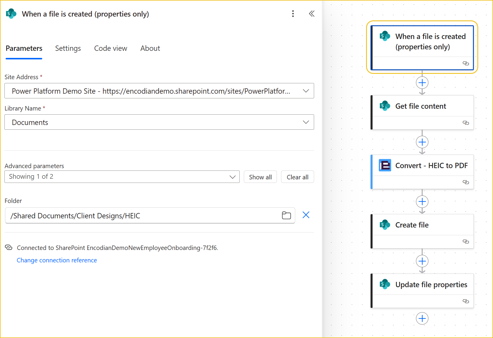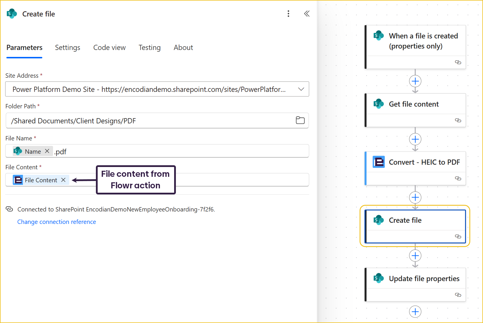 The Encodian Convert – HEIC to PDF action converts your image into a fully formatted PDF. The converted file is available within the ‘File content’ output property.