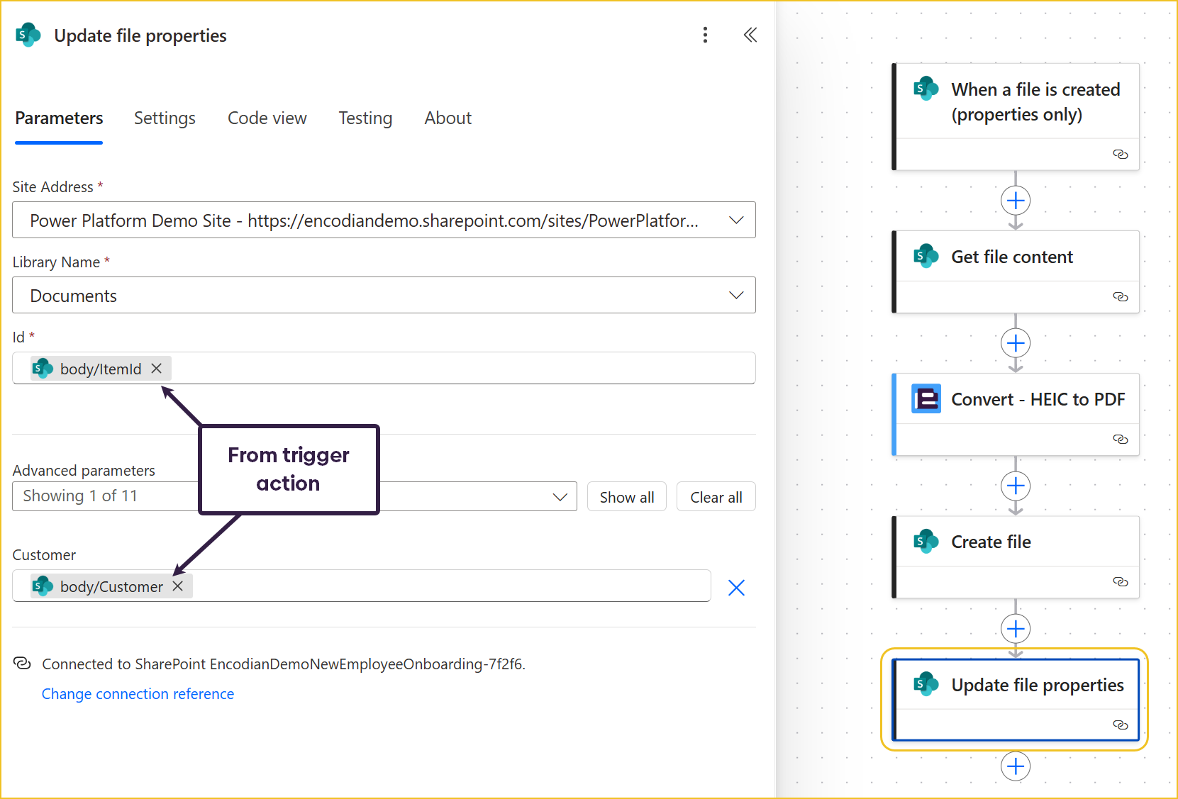 5.a. Action: Add the SharePoint ‘Update file properties’ action.