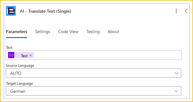 Here, we store the result of the translated text action in a variable called ‘result’. The inputs to the action are the same as those you would provide when using the action in Power Automate:
