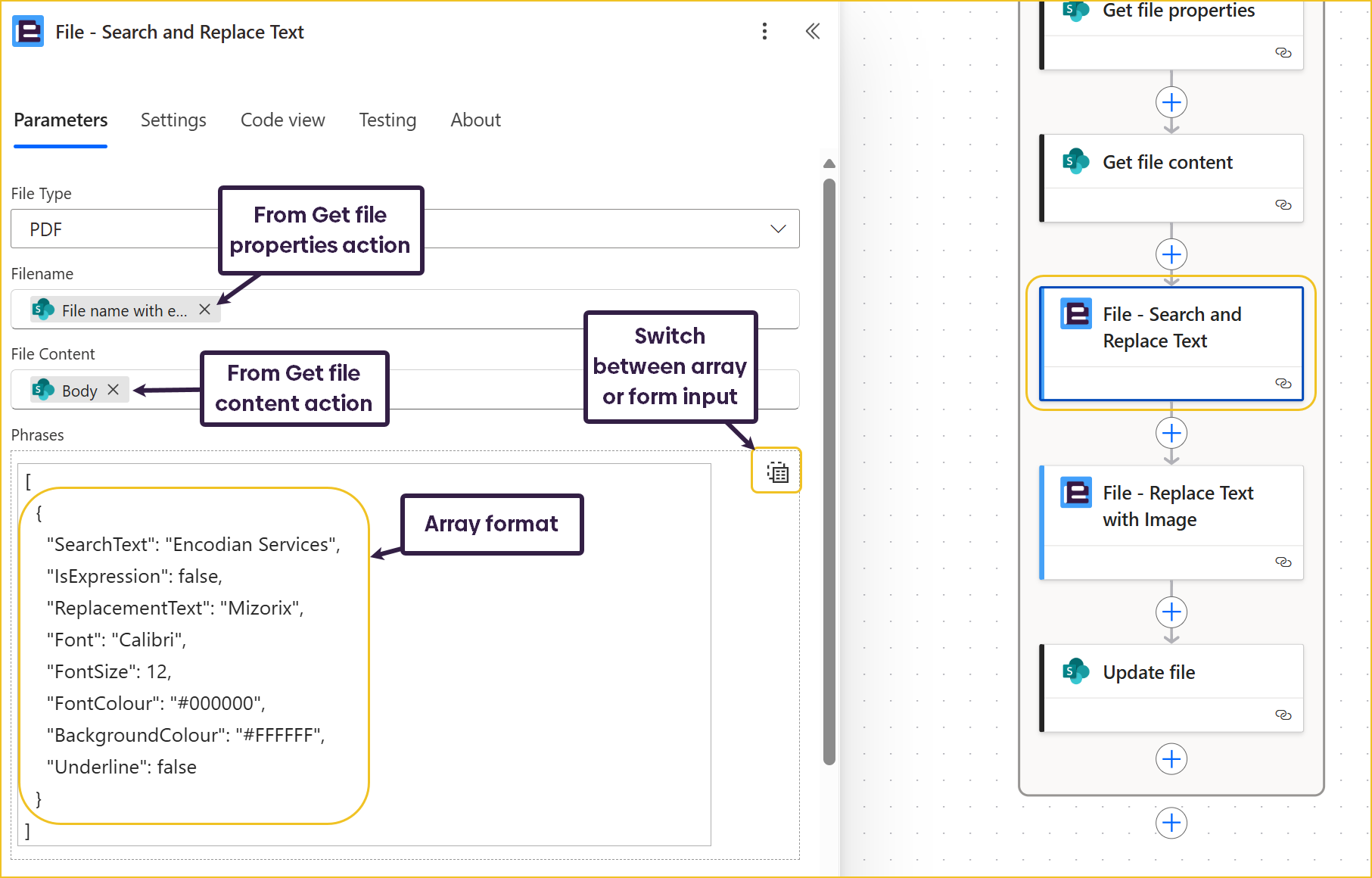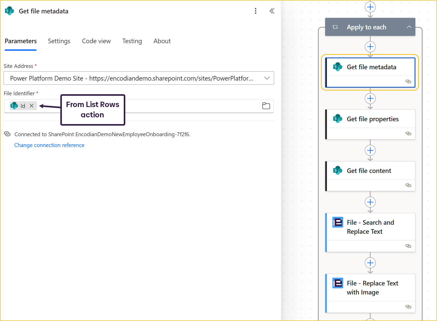 We’ll now use nested actions to retrieve the file metadata, properties, and content.