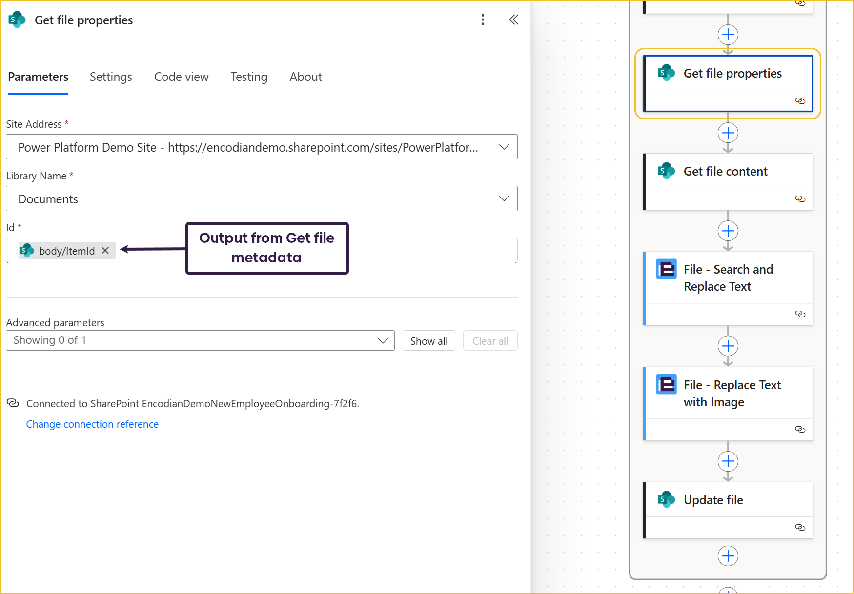 7.b. Item Id: Select the ‘ItemId’ output from ‘Get file metadata’.