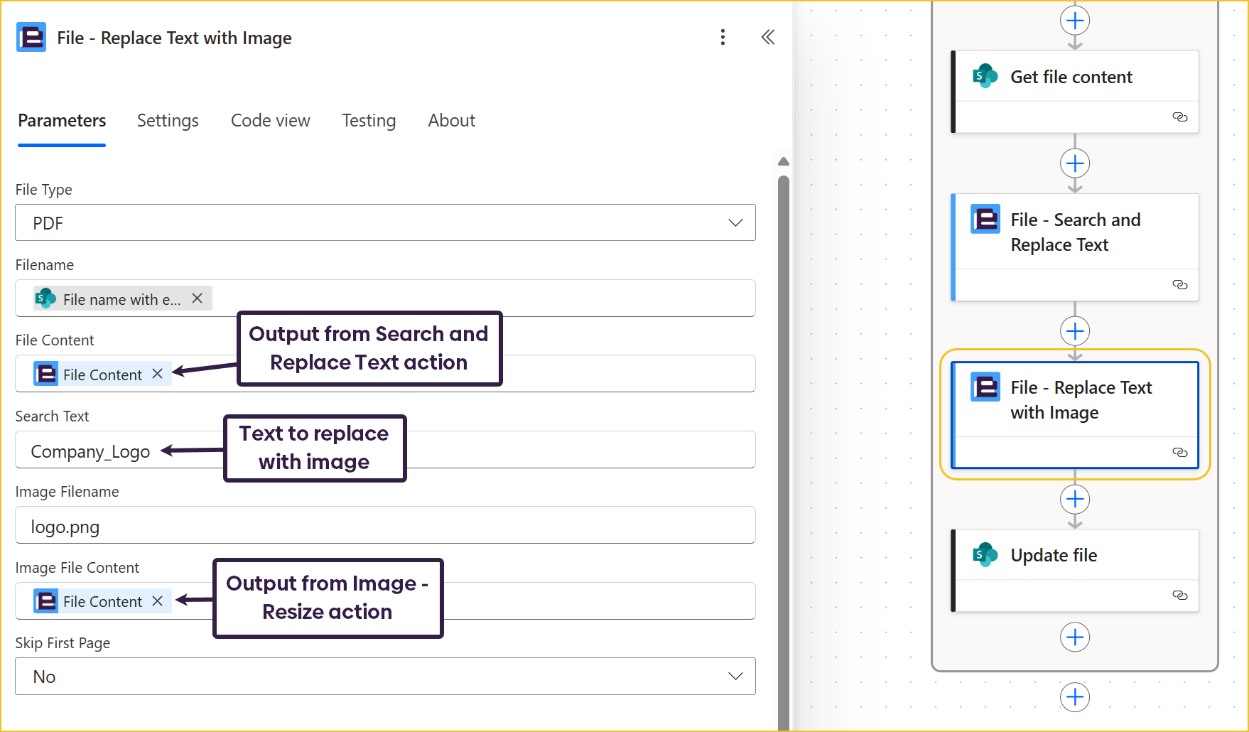 10.a. Action: Add the PDF – Replace Text with Image action.