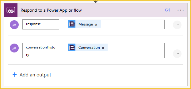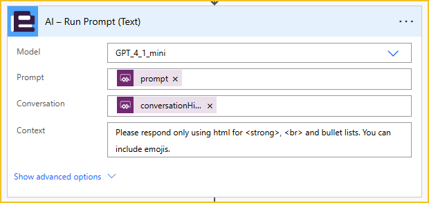 • Prompt & Conversation: the dynamic ‘prompt’ and ‘conversationHistory’ values from Power Apps (V2) action respectively