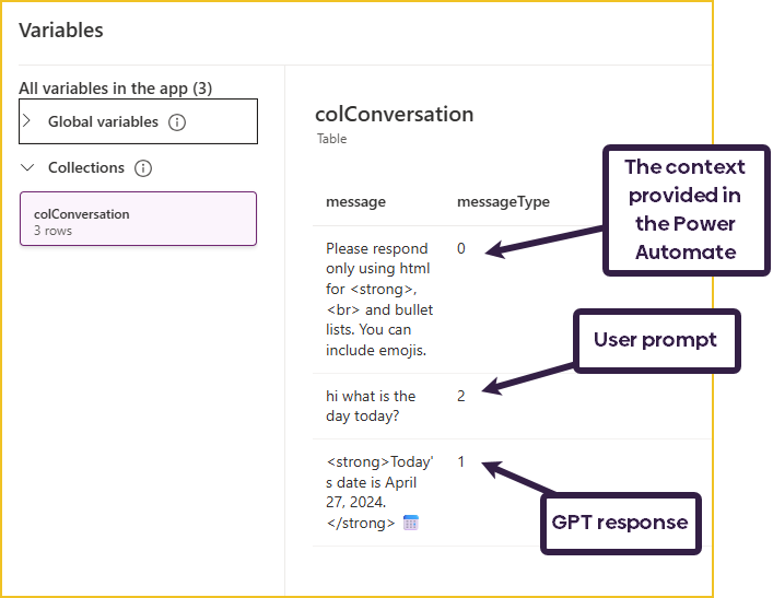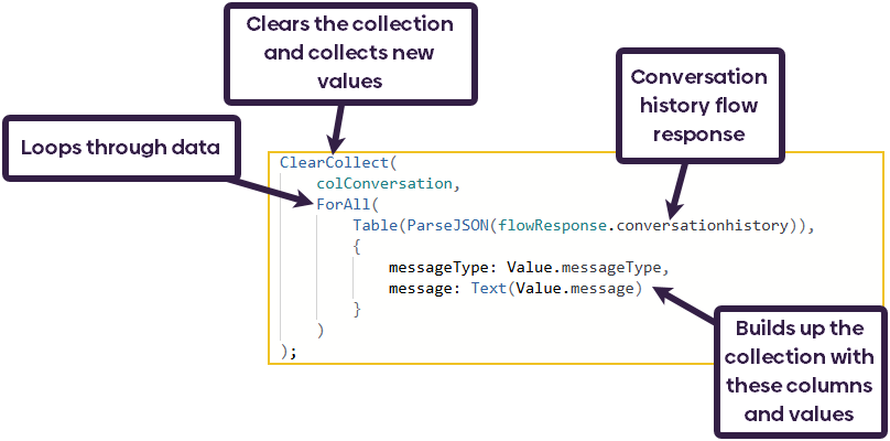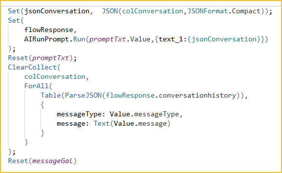 I set the conversation history response from the Power Automate in a collection called colConversation. We will cover the formula later, but let’s start with the collection: