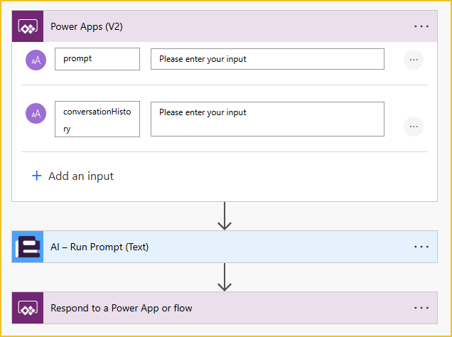 Before building the Power App UI, we need the flow that receives a prompt, sends it to the AI model, and returns a response.