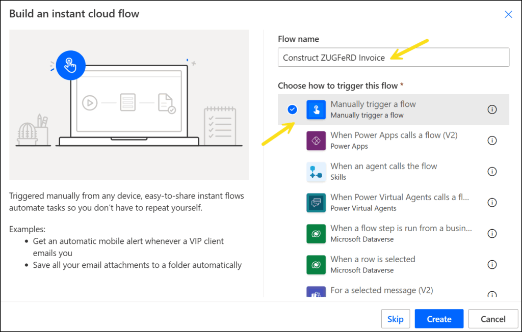 1.b. Trigger: Select the SharePoint ‘Manually trigger a flow‘ trigger action