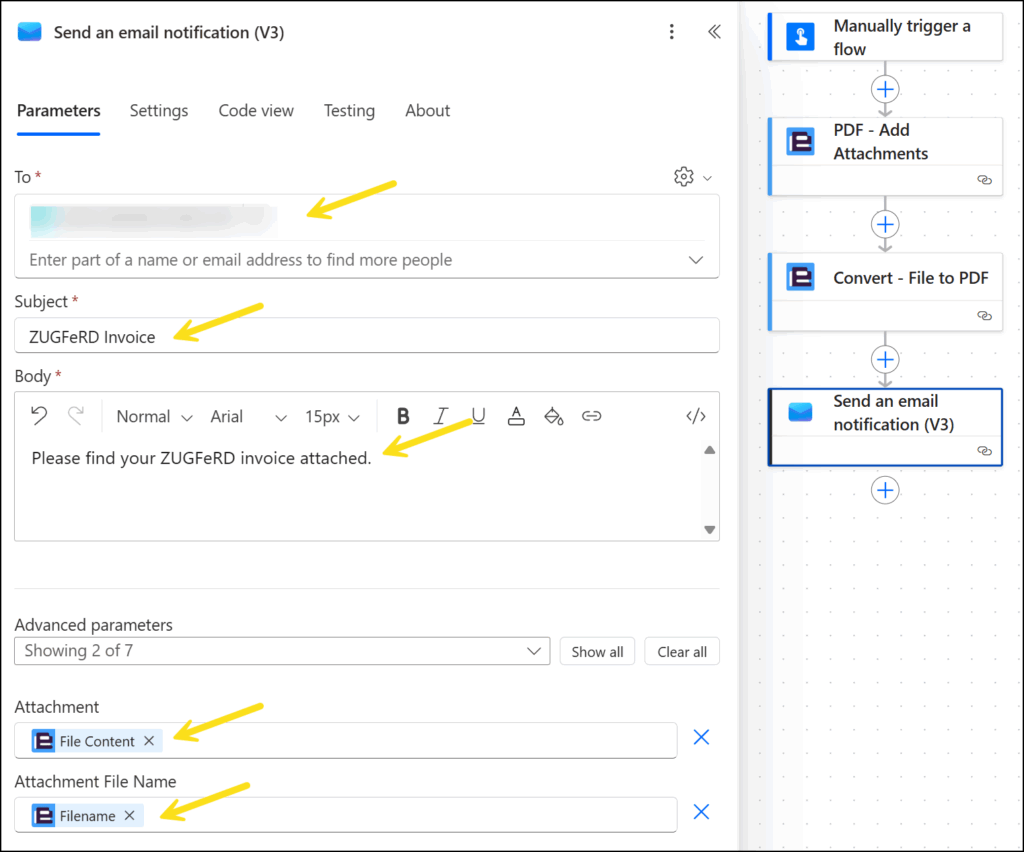 3.a. File Content: Select ‘Invoice contentBytes’ from the outputs of the ‘Manually trigger a flow’ trigger action.