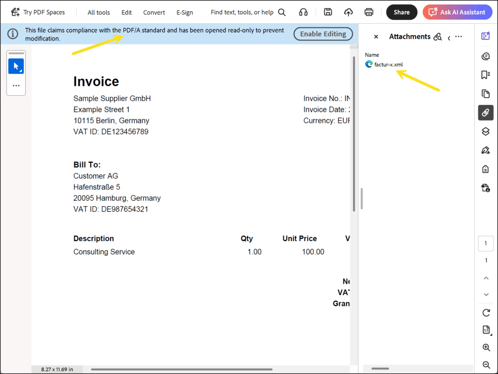 The PDF will demonstrate compliance with the PDF/A standard, with factur-x.xml embedded as an attachment.