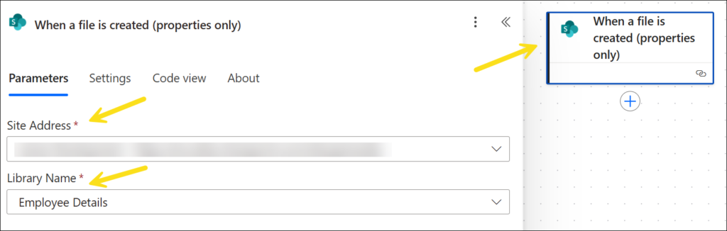 1c. Select trigger: When a file is created (properties only) (SharePoint)