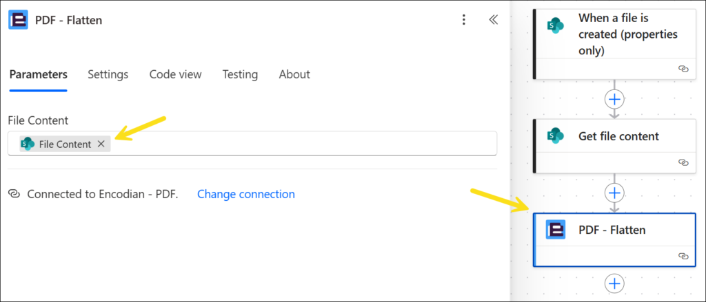 3. Add Encodian “PDF – Flatten”