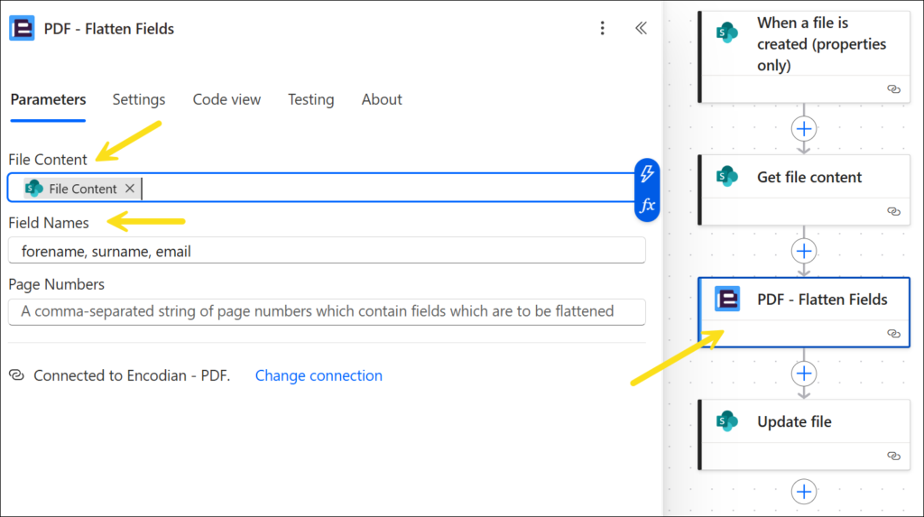 Encodian’s PDF – Flatten Fields action