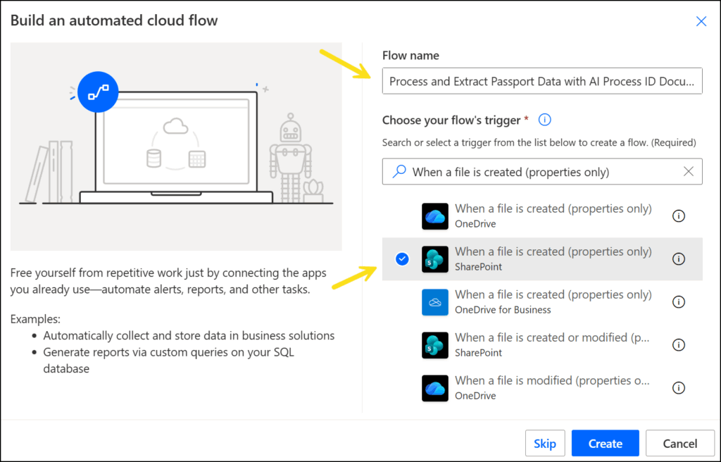 1.b. Trigger: Select the SharePoint ‘When a file is created (properties only)‘ trigger action