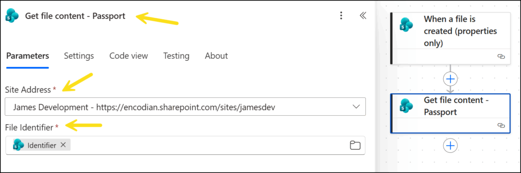 4.a. File Content: Select the ‘File Content’ output from the ‘Get file content – Passport’ action.
