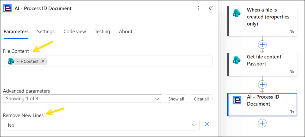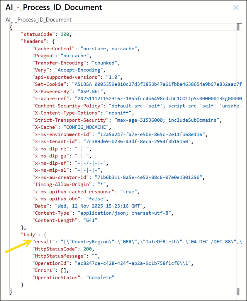 4.a. Content: Select the ‘Result’ output from the ‘AI – Process ID Document’ action.