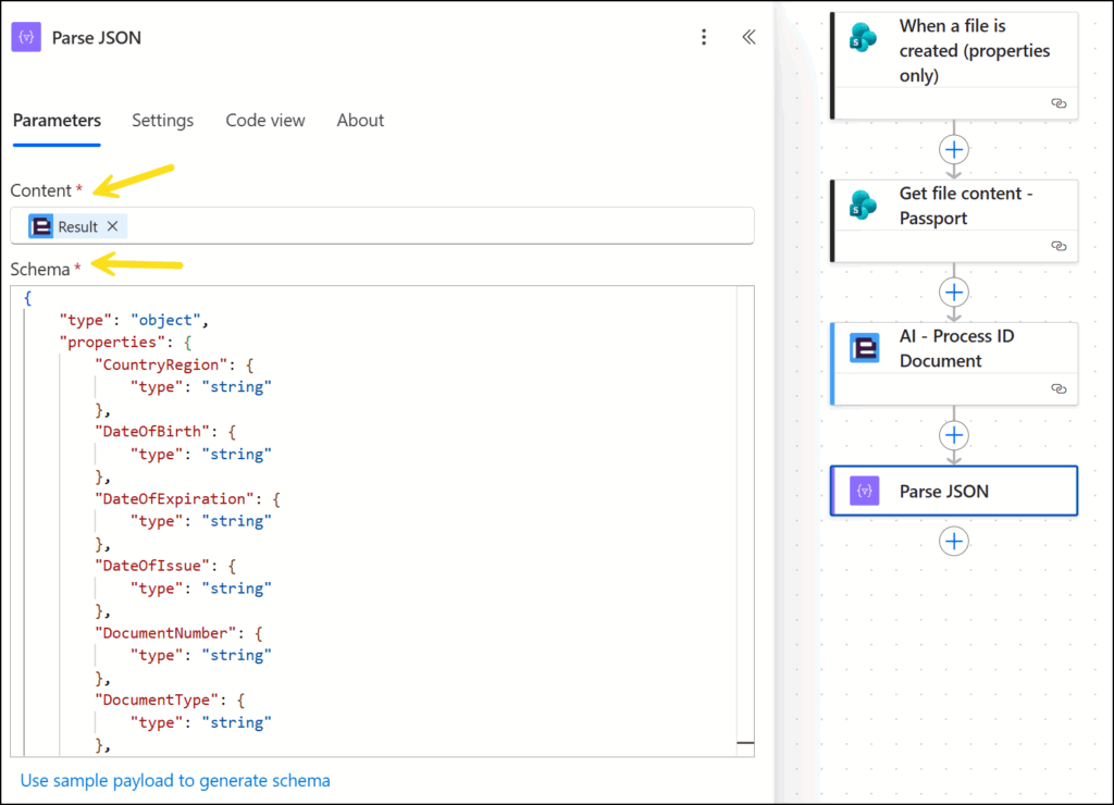 (Note: if using a different passport image or different types of ID documents than the ones provided, a sample schema can be generated by executing the flow, extracting the JSON output from the ‘AI – Process ID Document’ action, and using the ‘Use sample payload to generate schema’ option of the ‘Parse JSON’ action.)
