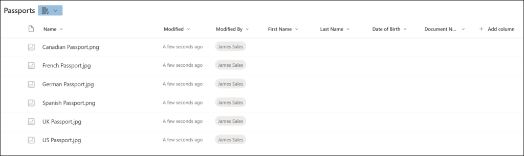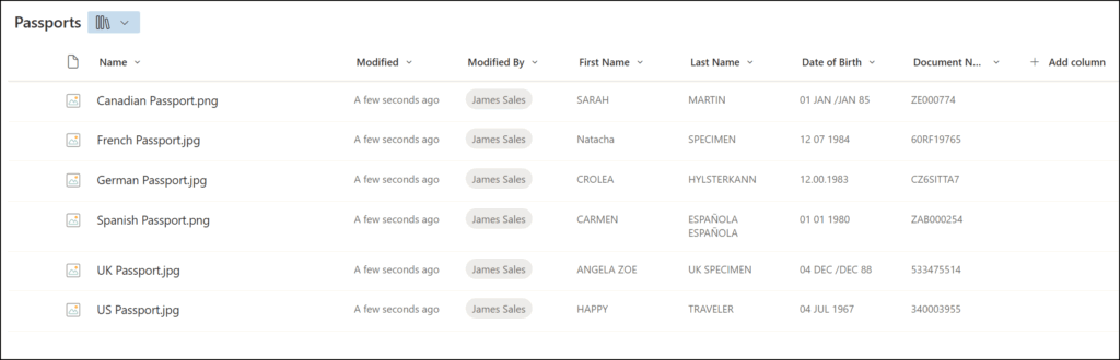 Upload the sample passport images to the ‘Passports’ document library. Await the execution of the Flow, then view the updated properties in the ‘Passports’ document library.